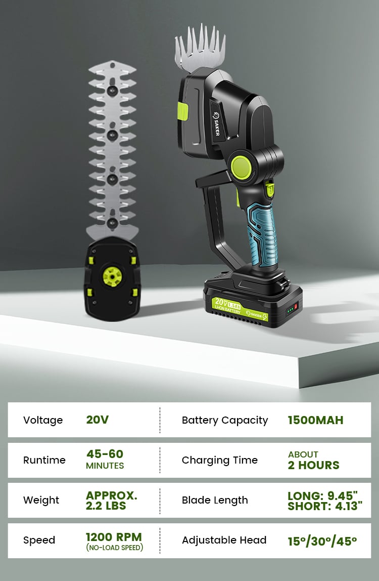 The side buttons on the hand held hedge trimmer cordless allow for easy adjustment of its angle, making it simple to use. It can meet your different needs in different situations.