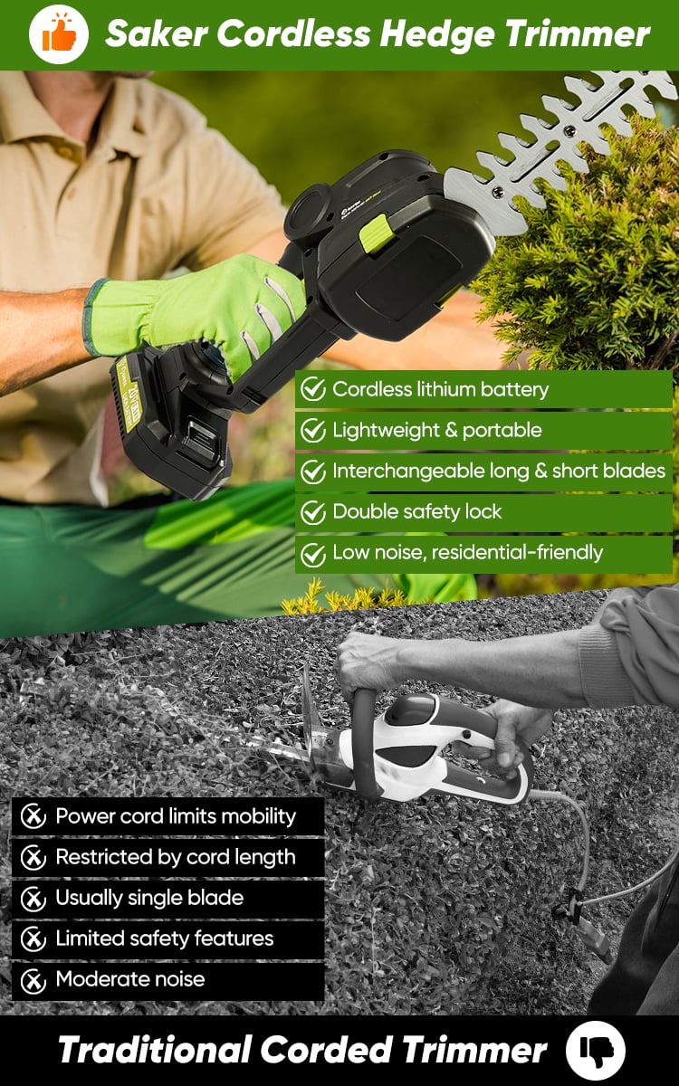 This saker safer cordless hedge trimmer is designed with a safety lock, and the machine can only be started after pressing the safety lock. This prevents accidental activation and protects your family.
