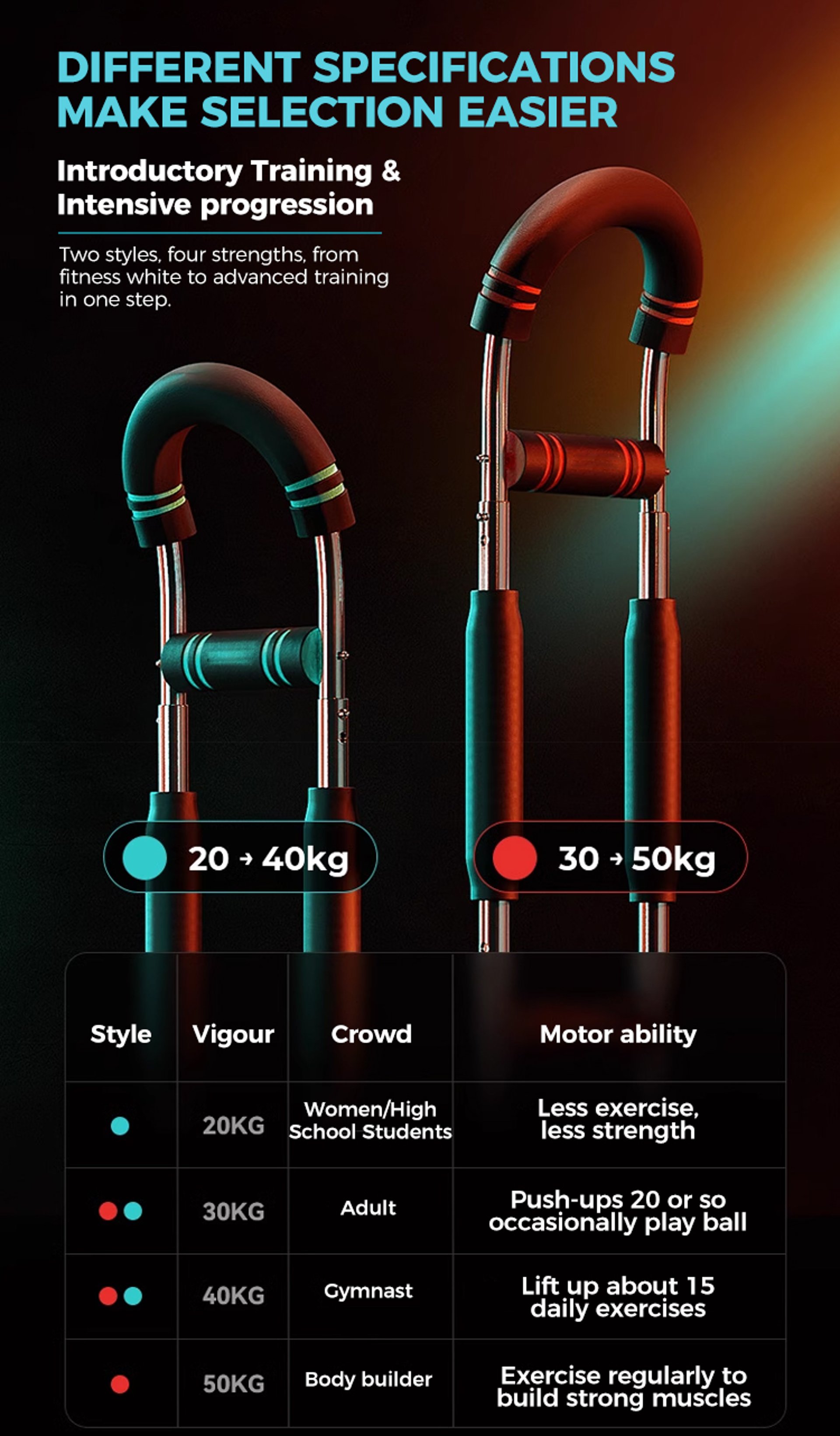 Ideal to strengthen the chest, arms, and shoulders. Perform various exercises to boost overall physical fitness and muscle power.