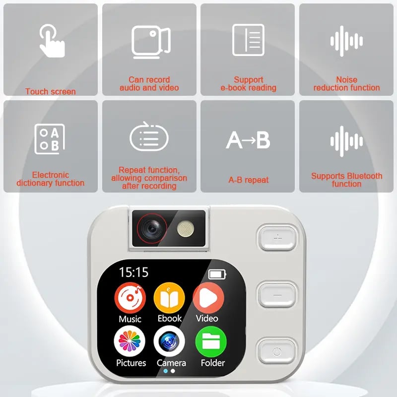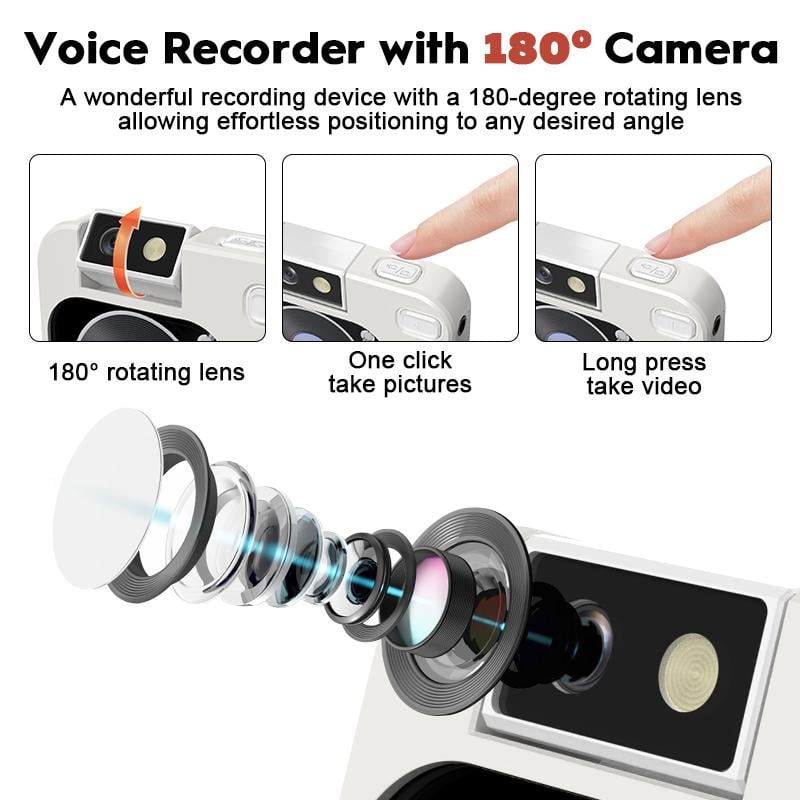 - Voice recorder with 180° camera: Adopts noise cancelling mic with professional recording chip, it's a wonderful recording device for lectures, meetings, and conversations. Audio player features a 180-degree rotating lens, allowing effortless positioning to any desired angle, and also offers an exceptional shooting experience. Not only can you record important content, but also effortlessly capture clear photos and videos, making it an indispensable companion in your life.