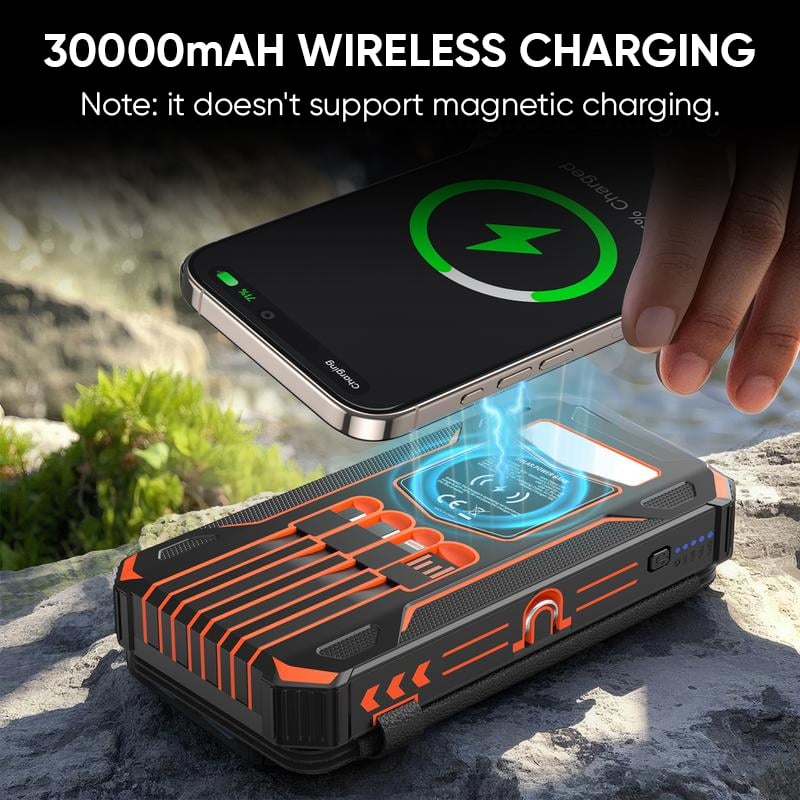 - 30000mAh Super Large Capacity: This solar power bank has a battery capacity of up to 30000mAh, which can charge your devices multiple times. It can be charged via an adapter or solar energy, so you don't need to worry about power outages.
